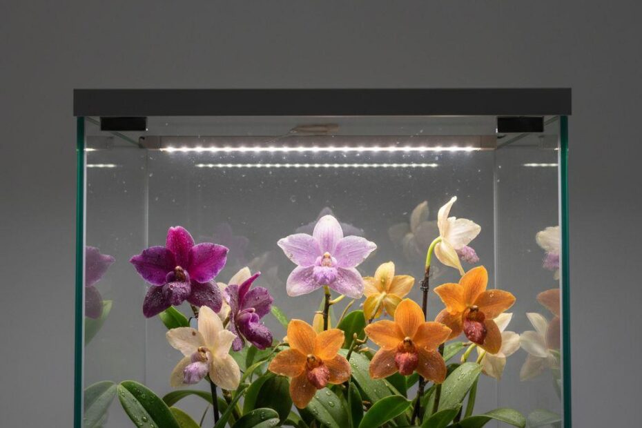 Orquídeas epífitas como Bulbophyllum evoluíram para captar luz filtrada em copas de árvores. Em vitrines internas, a luz direta do sol é rara ou indesejável — aí entram os LEDs com espectro controlado.